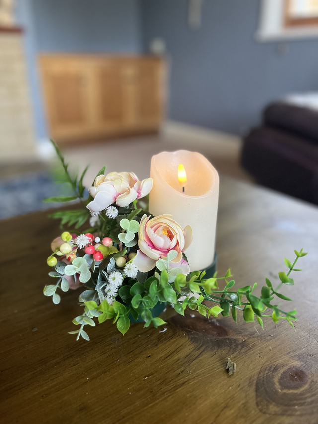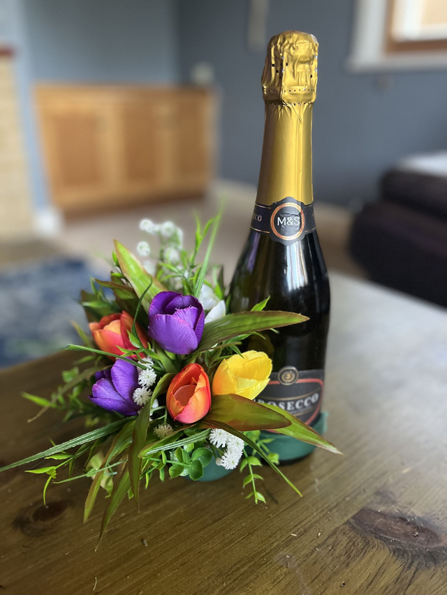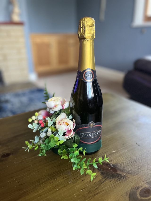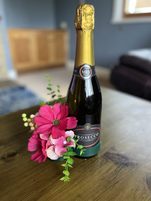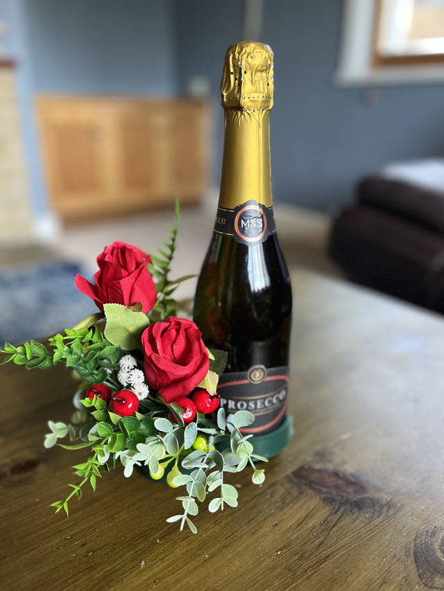 How lovely to bring a bottle and some beautiful flowers attached to it. Straight away making it a centre piece at the table. When you’re finished with the bottle, if you wish it can be placed on a tall candle making it long lasting. I can use different type of flowers of your choice.
