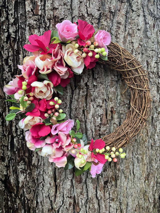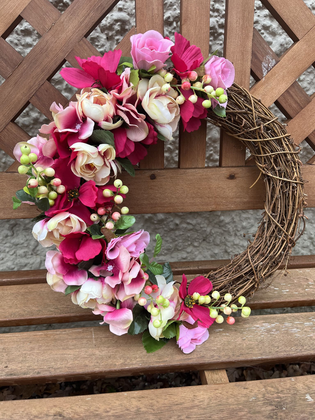Artificial various pink flowers with a few cream and pink berries thrown in.