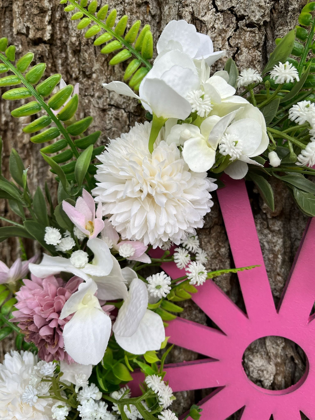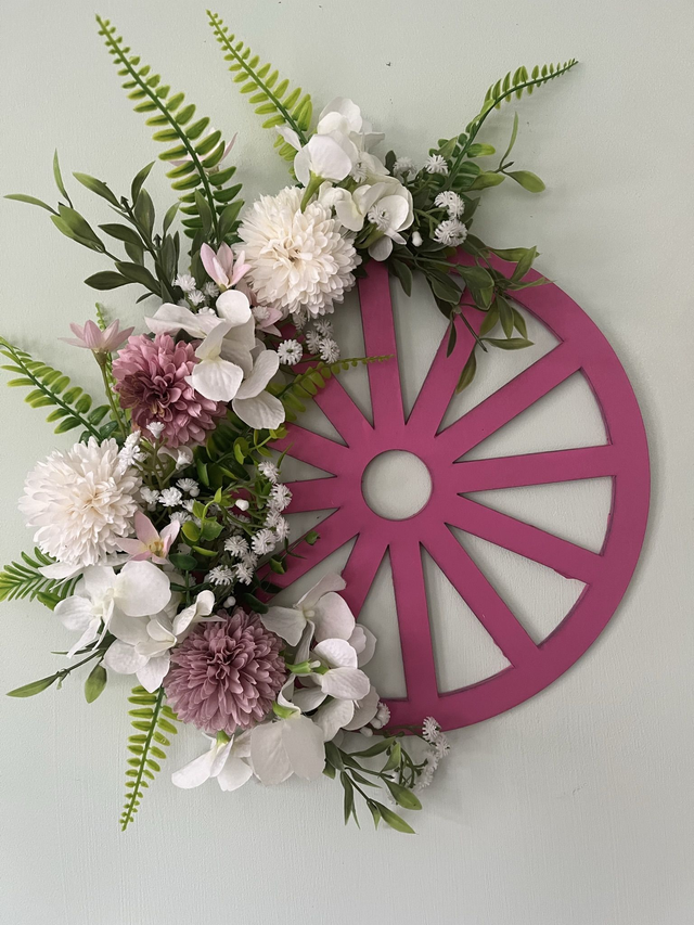 Hand painted wooden pink wheel with various artificial pink a white Hydrangea, baby breath flowers and green foliage.